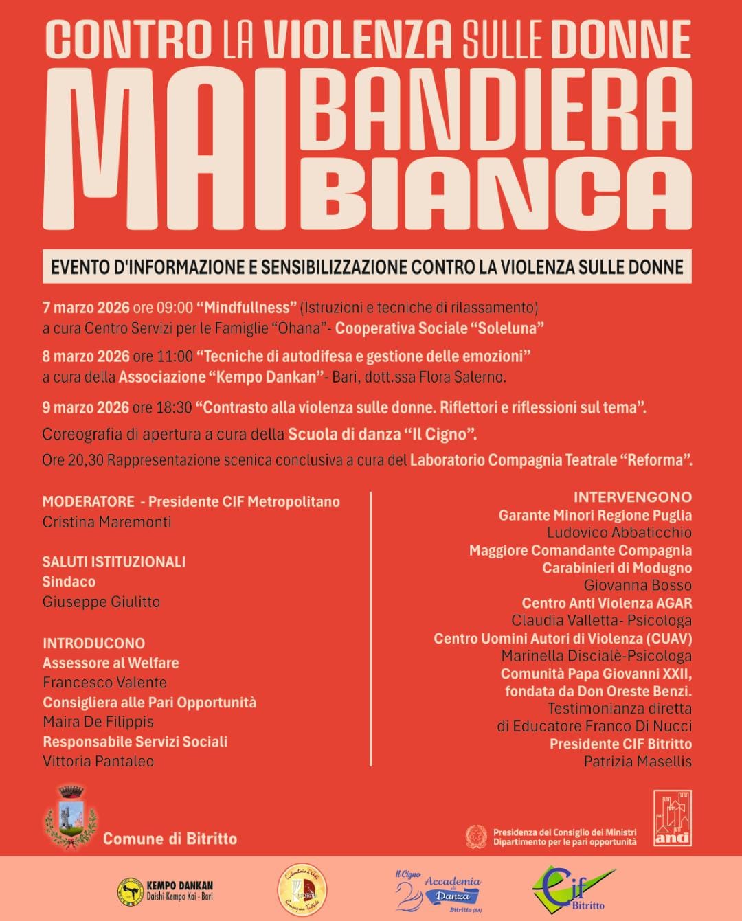 Vi aspettiamo all’evento d’informazione e sensibilizzazione contro la violenza sulle donne promosso dal Comune di Bitritto presso la Sala Castello che si articolerà in tre giornate:
